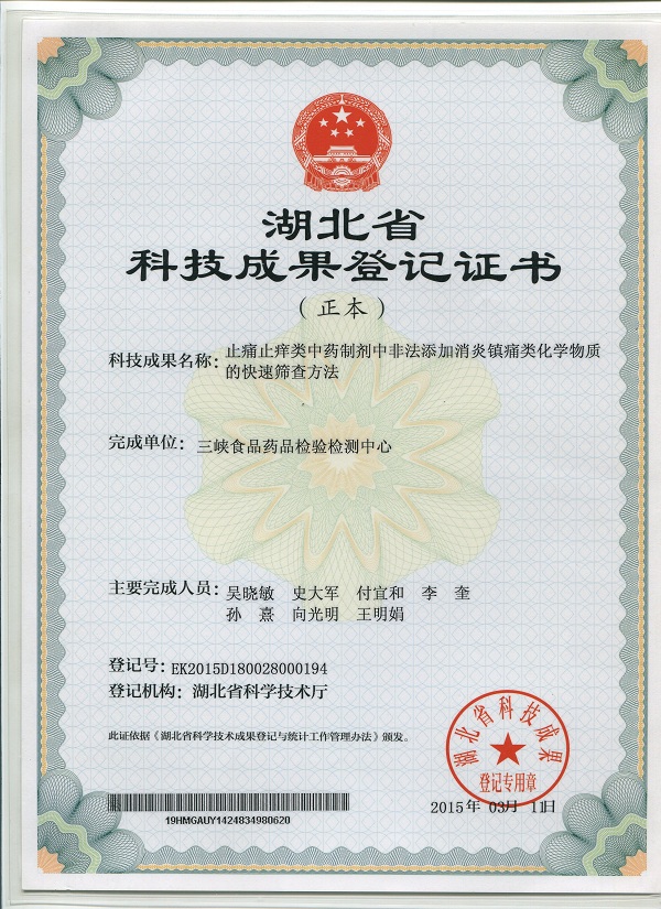 近日,三峡食品药品检验检测中心承接的宜昌市科技攻关项目“止痛止痒类中药制剂中非法添加消炎镇痛类化学物质的快速筛查方法”项目(编号A11301-60)获宜昌市技术发明三等奖。该项目是由吴晓敏、史大军、付宜和、李奎、孙熹等人研究完成。