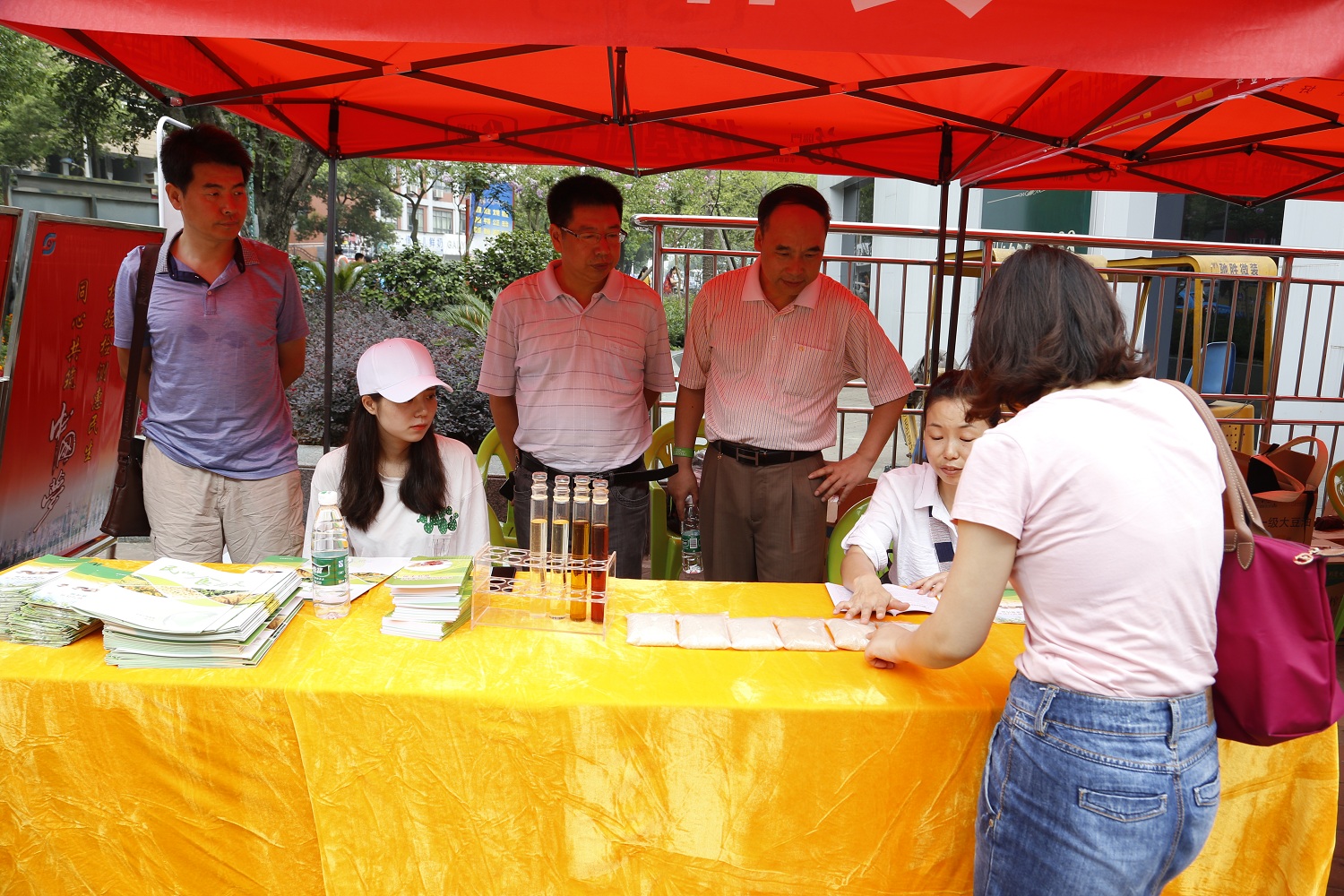 按照市食安办和市文明办等20部门的统一部署,7月12日,三峡食品药品检验检测中心与宜昌市粮食局在五一广场举办了以“尚德守法、共治共享食品安全”为主题的食品安全宣传周活动,中心副主任陈绪华、食品检验所所长刘健同志带领检验技术人员参加了活动,通过设立宣传咨询台、悬挂宣传标语、设置宣传展板、发放宣传册等形式,帮助市民了解粮油食品安全知识,技术人员还现场对如何鉴别粮油、食品质量进行了耐心的讲解,得到了广大市民的一致好评。