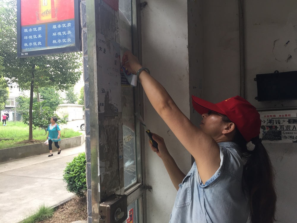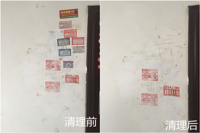 经过两个多小时的辛勤劳动,共清除5个单元楼内的野广告,令单元楼里里外外的环境卫生得到了改善。