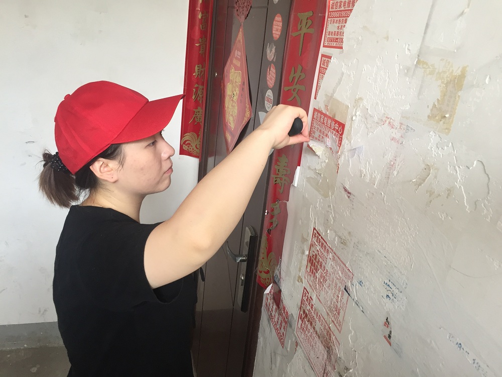 志愿者们手拿小铲,在社区工作人员的指导下,将张贴的小广告一一铲除。印刷上去的小广告后续将用涂料遮盖。志愿者们两三人一组,大家相互配合。