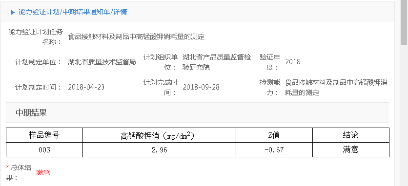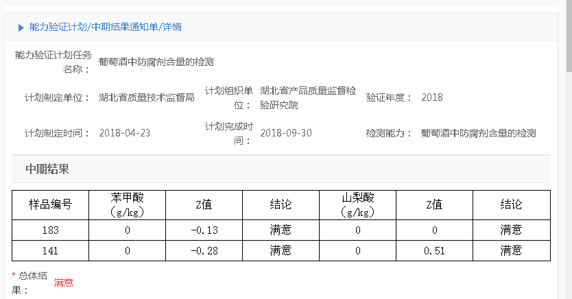 为保障检验检测机构资质认定工作的有效性,验证和提升检验检测机构的能力和水平,加强获证检验机构事中事后监管,根据《检验检测机构资质认定管理办法》的要求,省质监局在涉及民生和人民群众关注度高的领域组织开展2018年度能力验证工作,日前,从承办单位湖北省产品质量监督检验研究院传来中期报告:三峡检验检测中心参加的葡萄酒中防腐剂含量的检测;食品接触材料及制品中高锰酸钾消耗量的测定二项能力验证均获得满意的好成绩。