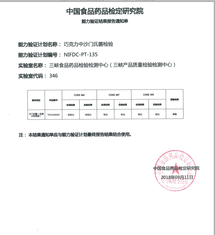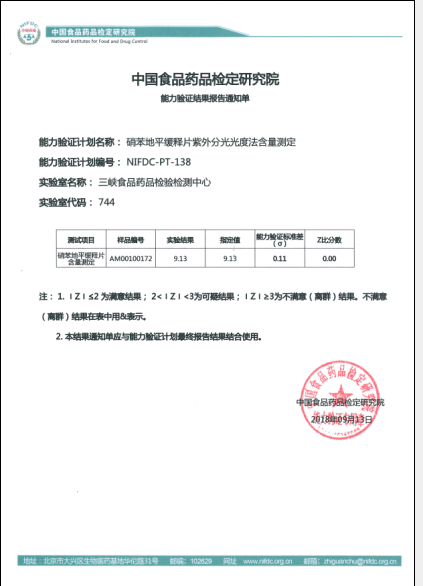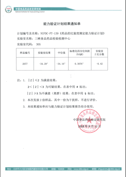 三峡食品药品检验检测中心日前接到中国食品药品检定研究院发来的3份2018年能力验证计划结果通知单,3个计划均以优异成绩获得满意结果。分别是药品的比旋度,Z比分数为-0.42;硝苯地平缓释片紫外分光光度法含量测定,Z比分数为0.00;巧克力中沙门氏菌检验,定性结果满意。