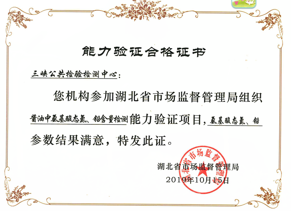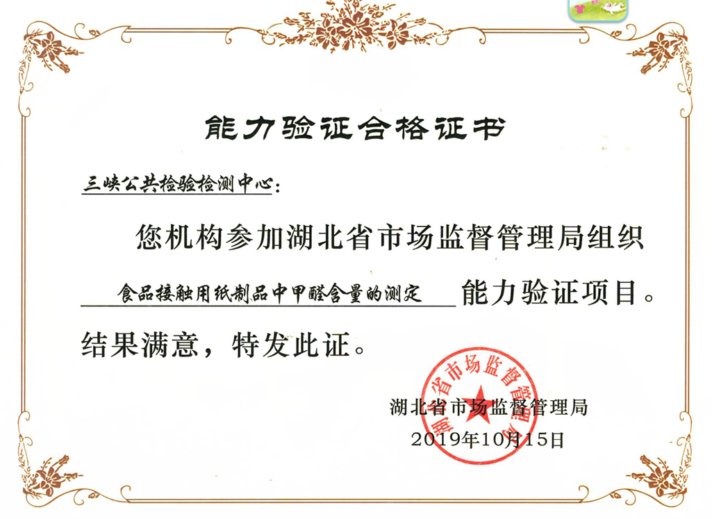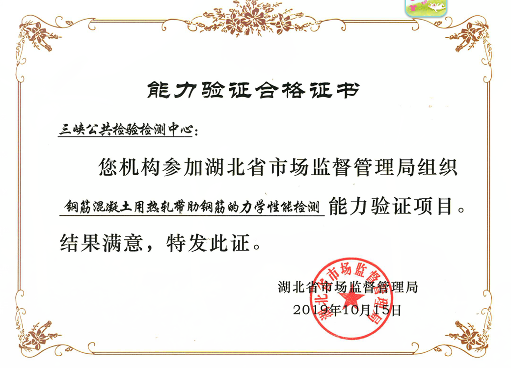 三峡公共检验检测中心参加了钢筋混凝土用热轧带肋钢筋的力学性能检测;食品接触用纸制品中甲醛含量的测定和酱油中氨基酸态氮、铅含量检测3个项目的能力验证。日前从省市场监管局收到证书,3项能力验证均获得满意的好成绩。