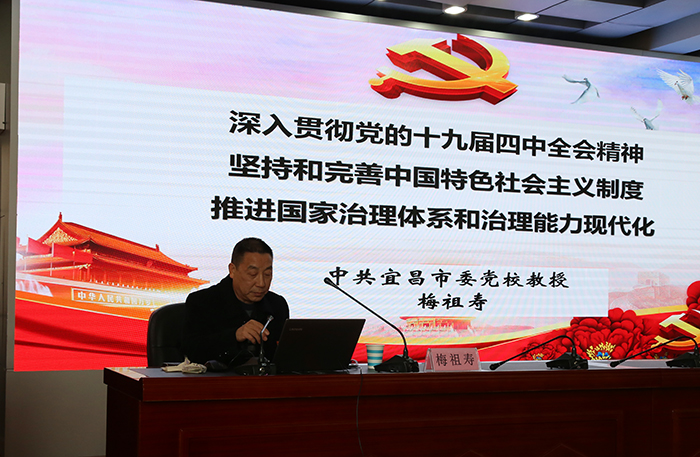 宣讲报告中,梅祖寿从充分认识坚持和完善中国特色社会主义制度、推进国家治理体系和治理能力现代化的重大意义;深刻领会中国特色社会主义制度和国家治理体系的显著优势,坚定中国特色社会主义制度自信;准确把握坚持和完善中国特色社会主义制度、推进国家治理体系和治理能力现代化的总体要求、总体目标和重点任务;加强党的领导,确保全会确定的各项目标任务全面落实到位等四个方面,紧密联系国情党情,联系新中国成立70年取得的辉煌成就,对党的十九届四中全会精神进行了全面系统的阐释和解读。