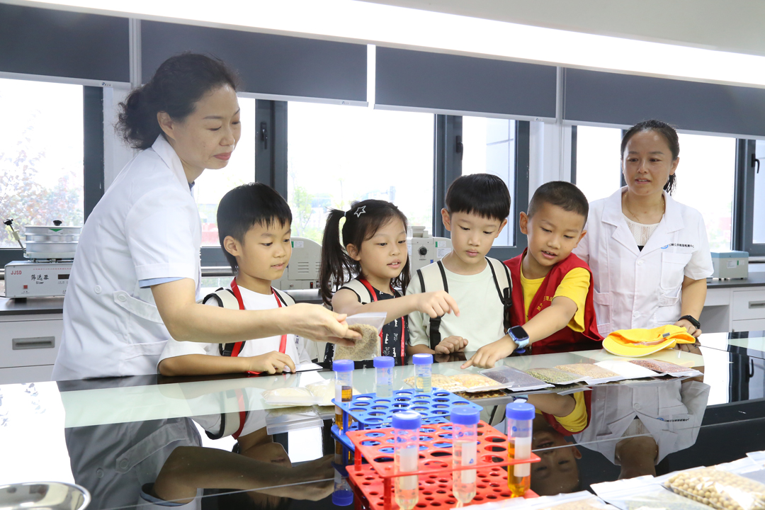 学生代表在中心技术人员的引领下,实地参观了粮油、陶瓷、轻工等检测实验室,开展了“酸碱滴定反应”“粮油感官鉴别”“玩具弹射动能测试”等有趣的互动性检测小实验,了解实验室内“高精尖”仪器设备的功能和检测范围。