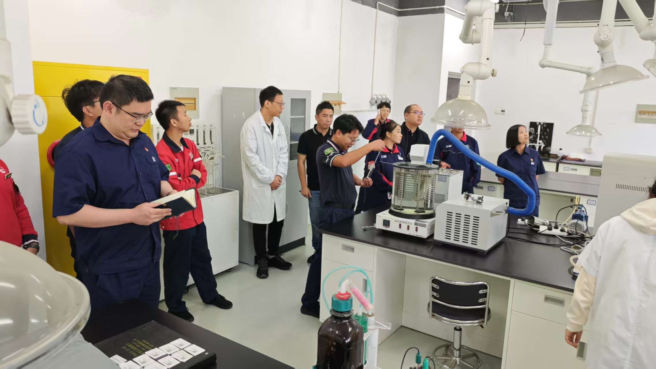 中国石化宜昌石油一行参观了中心化工检测室、汽柴油及液化石油气检测室。中心技术人员现场演示了油品密度、闪点、硫含量等关键质量指标的检测流程,并详细介绍了确保检测数据准确性的质量控制方法。