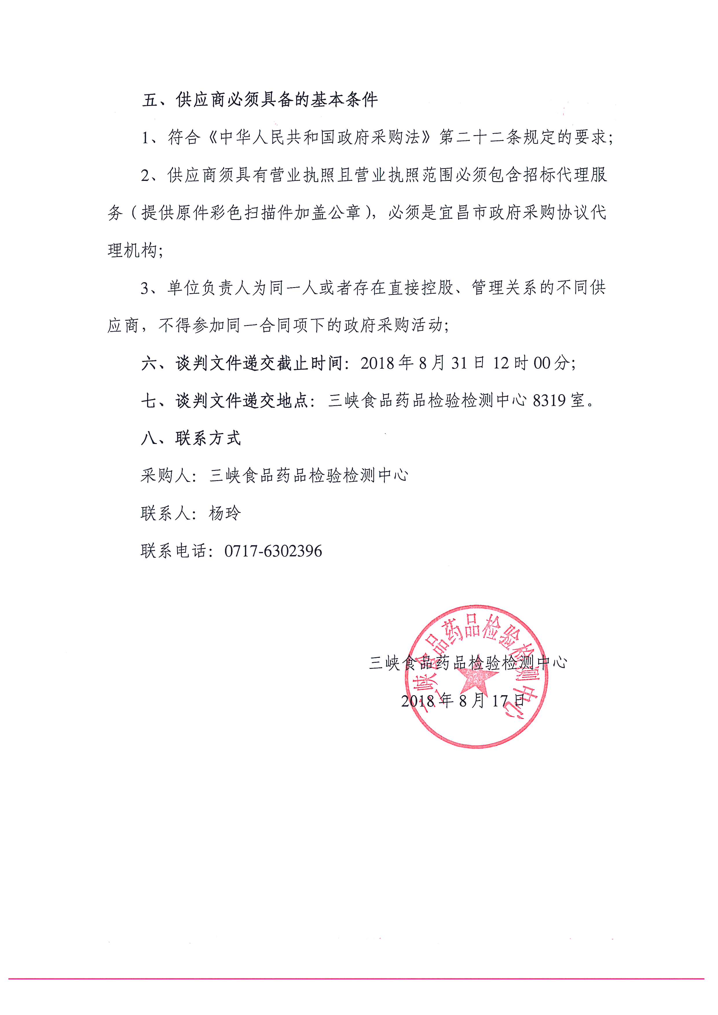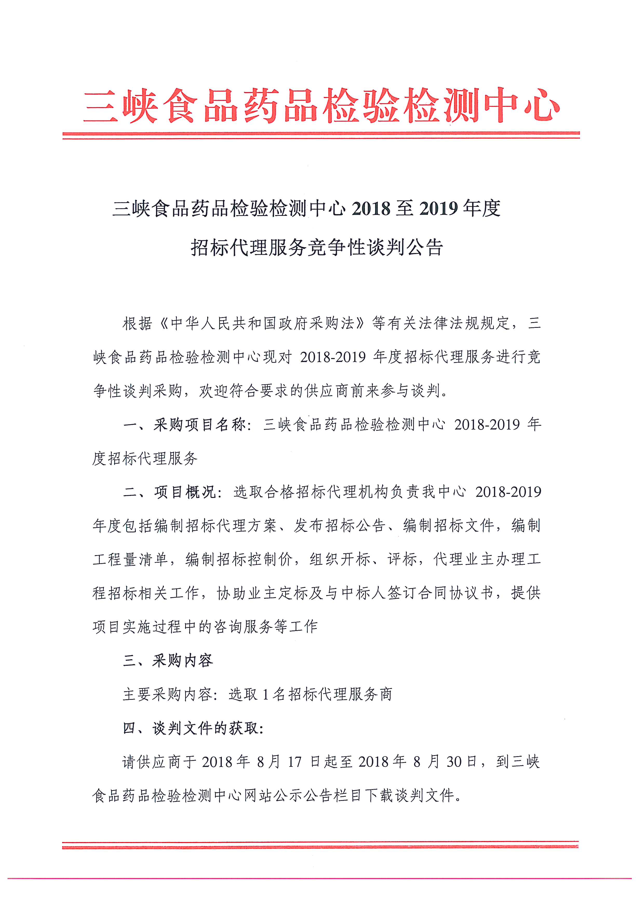 三峡食品药品检验检测中心2018至2019年度招标代理服务竞争性谈判公告
