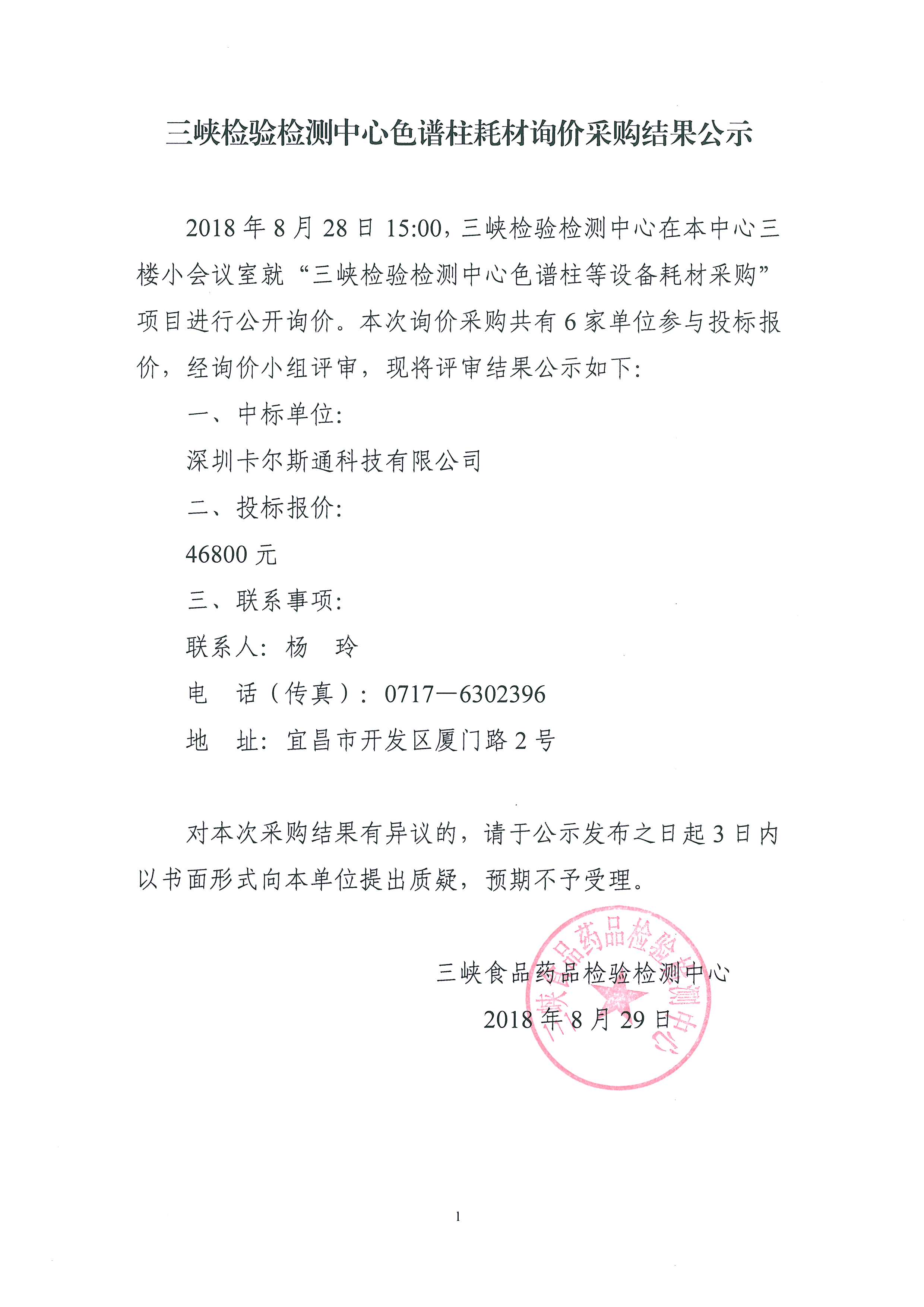 三峡检验检测中心色谱柱耗材询价采购结果公示
