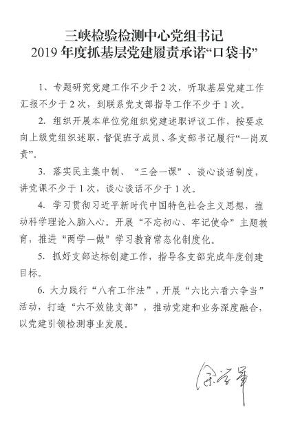 三峡公共检验检测中心党组书记2019年度抓基层党建履责承诺“口袋书”