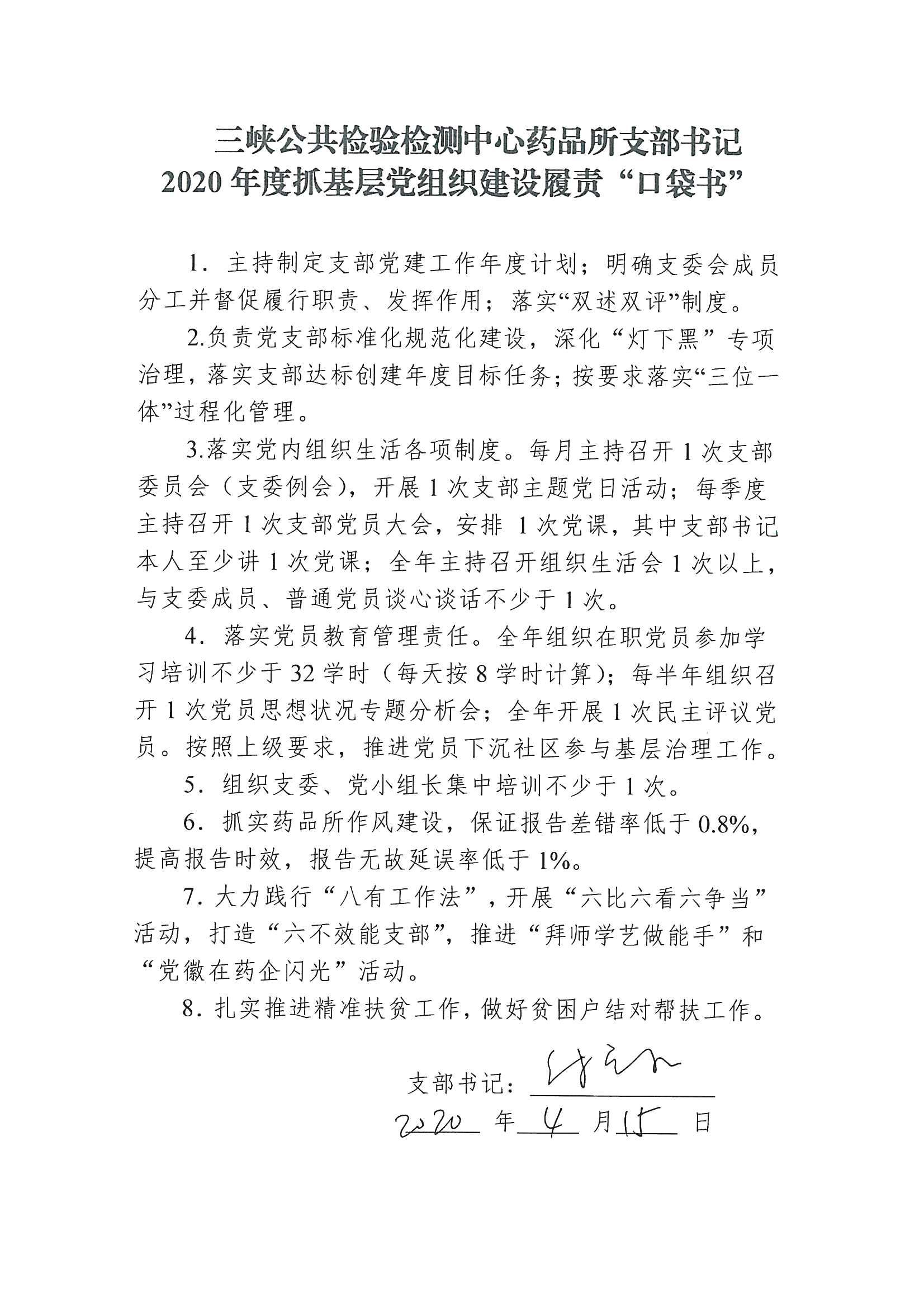 三峡公共检验检测中心药品所党支部书记2020年度抓基层党组织建设履责“口袋书”