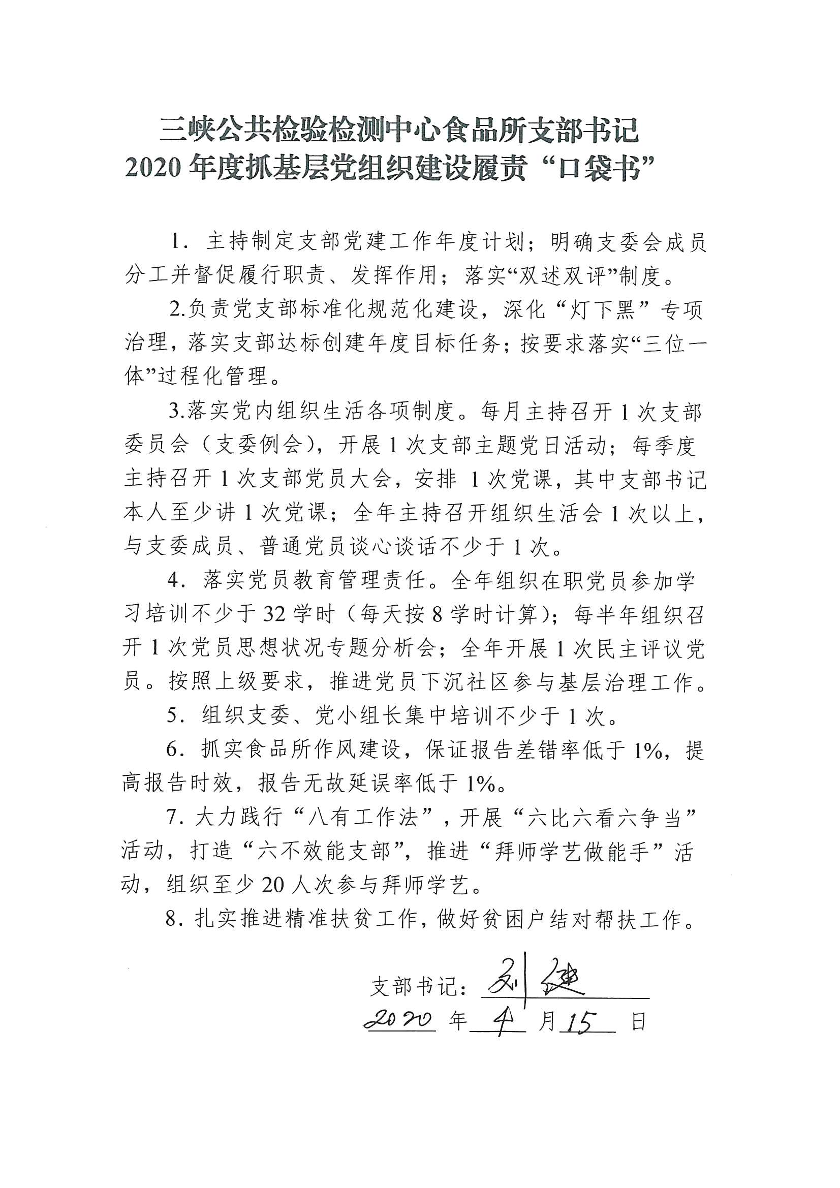 三峡公共检验检测中心食品所党支部书记2020年度抓基层党组织建设履责“口袋书”
