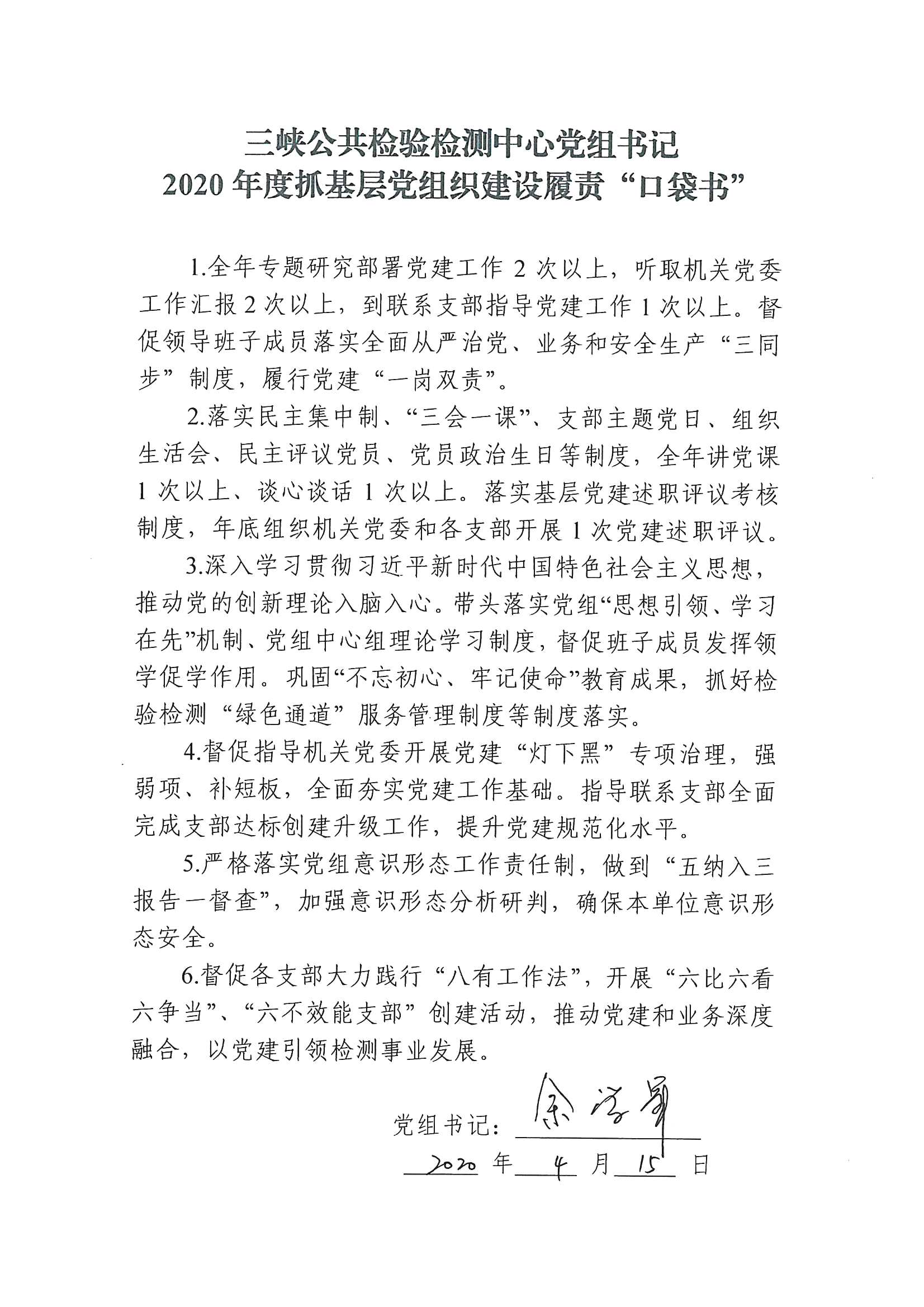 三峡公共检验检测中心党组书记2020年度抓基层党组织建设履责“口袋书”