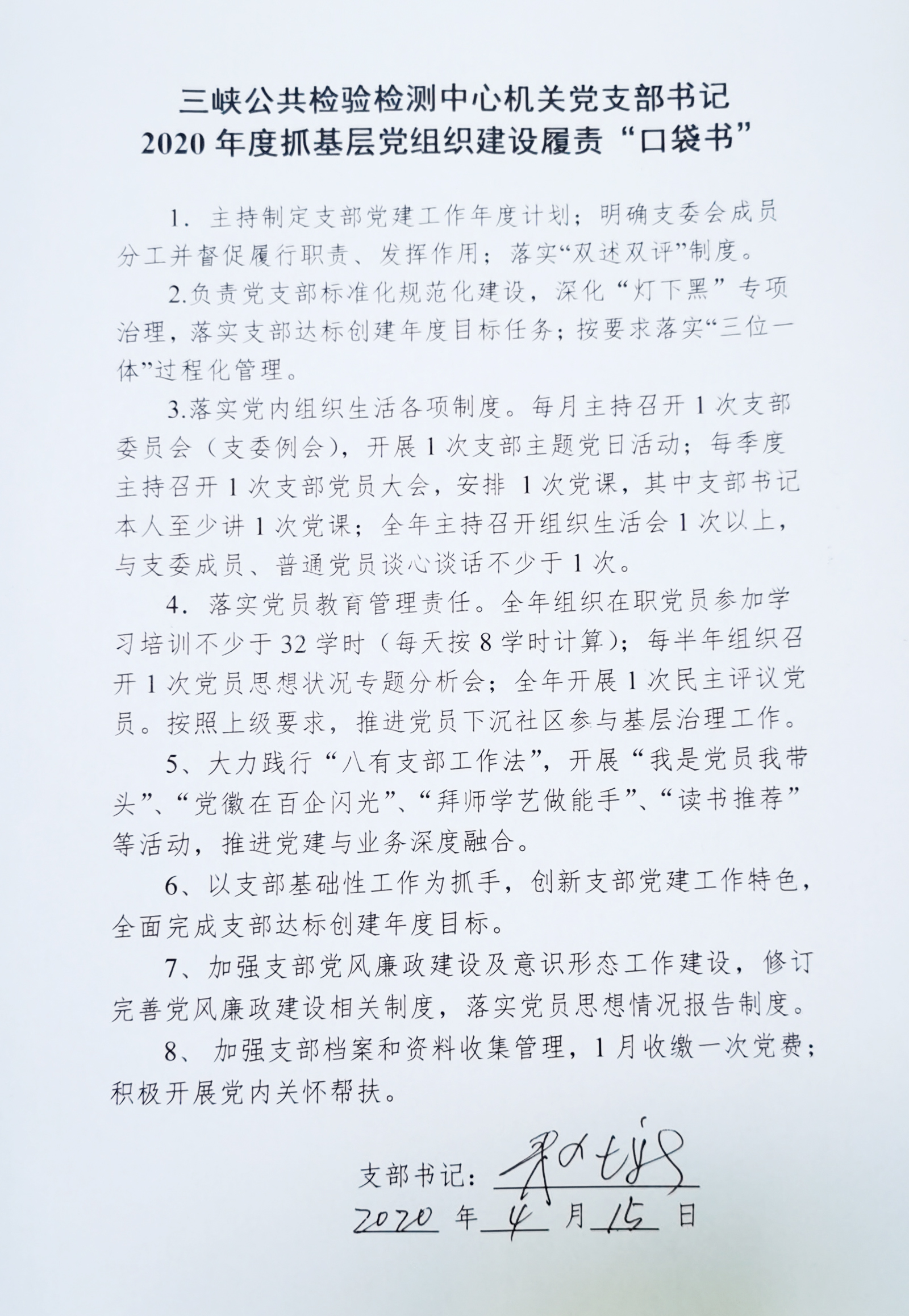 三峡公共检验检测中心机关党支部书记2020年度抓基层党组织建设履责“口袋书”
