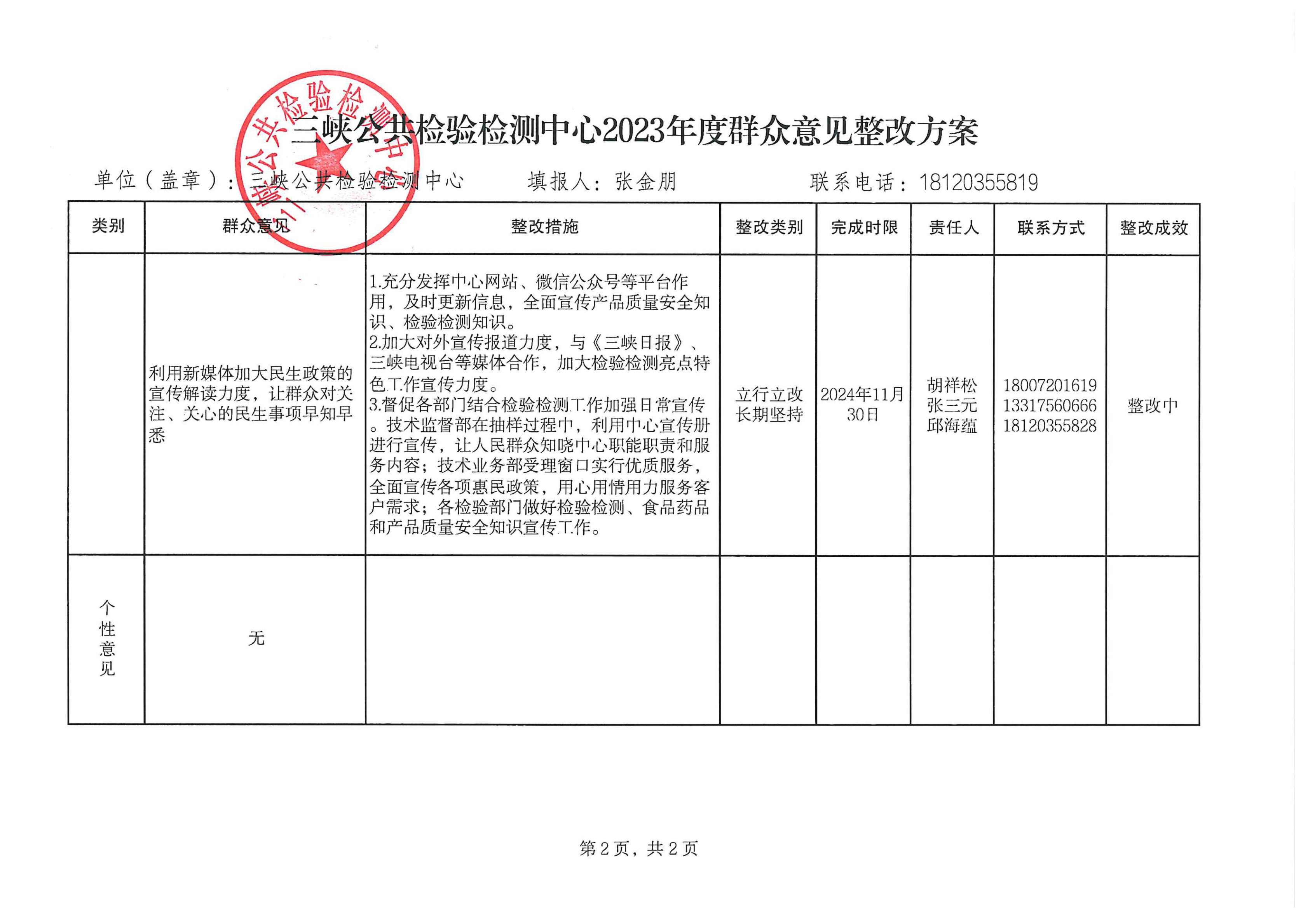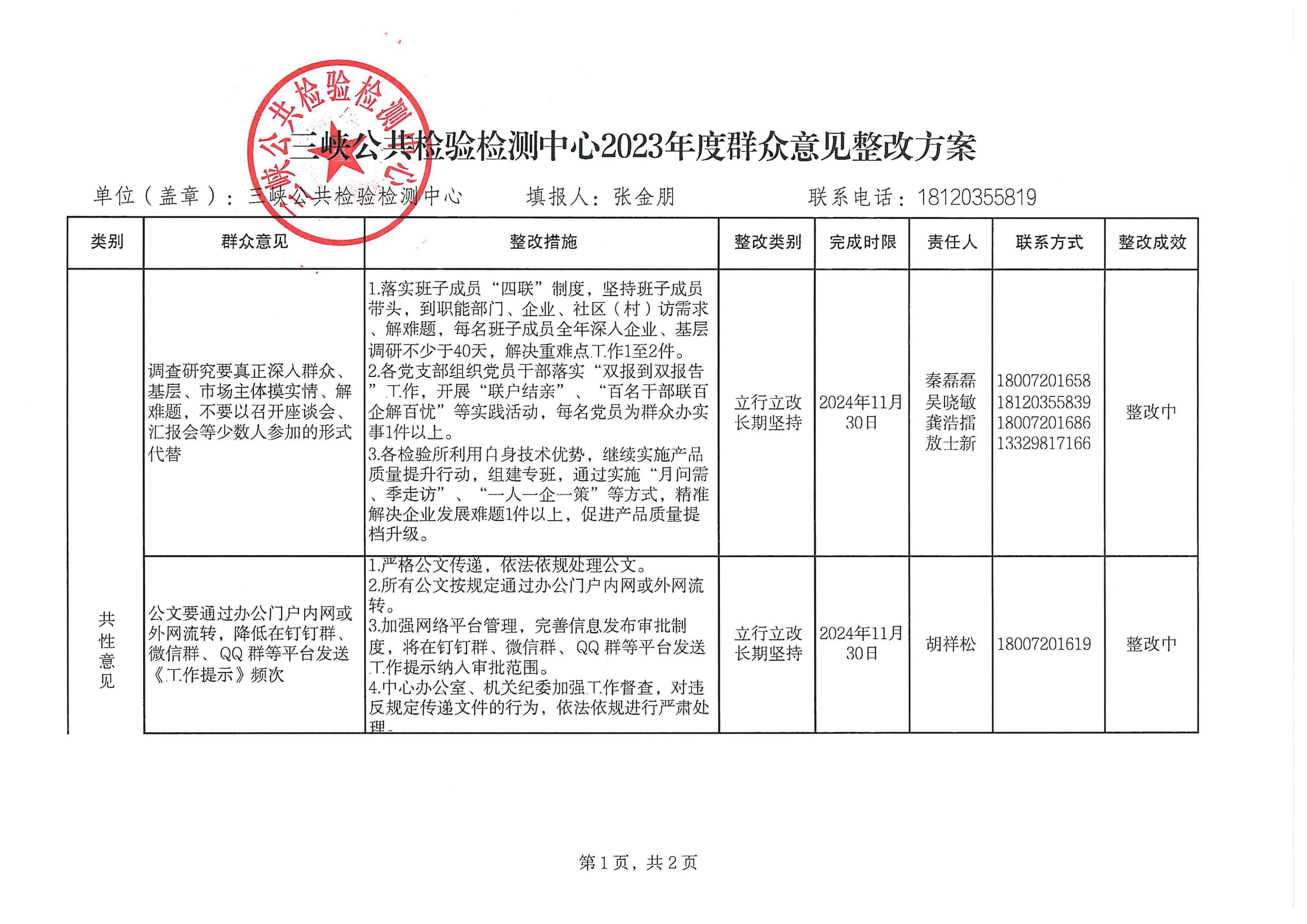 三峡公共检验检测中心2023年度群众意见整改方案
