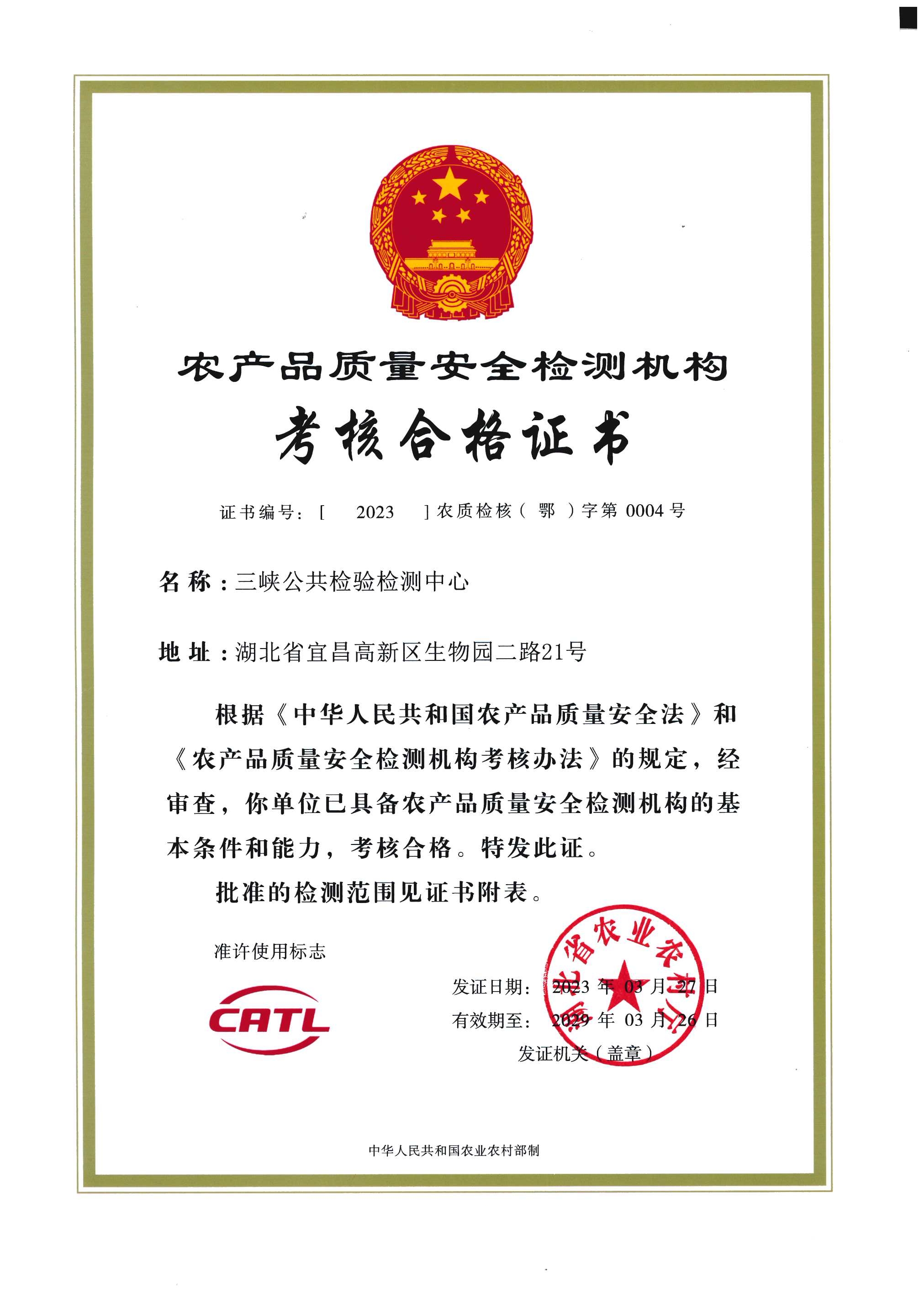 农产品质量安全检测机构考核合格证书