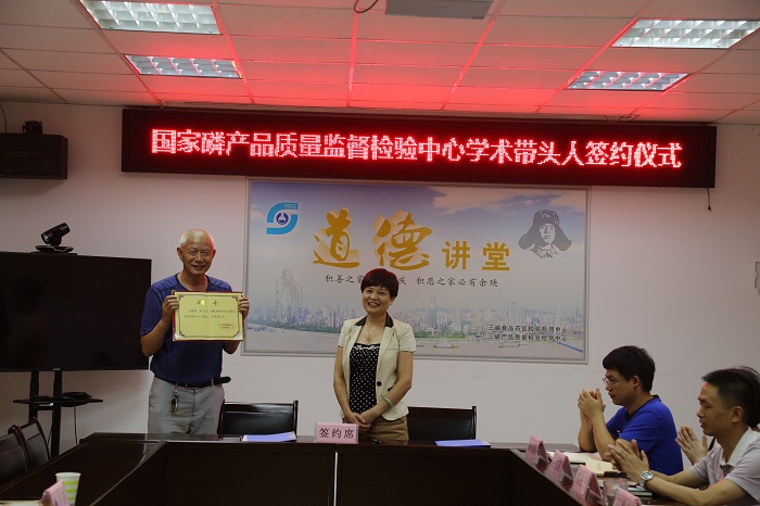 7月30日下午,三峡公共检验检测中心举办国家磷产品质量监督检验中心学术带头人签约仪式,聘用武汉工程大学潘志权教授为国检中心学术带头人。市市场监督管理局党组书记、局长黄传喜致辞,三峡大学生物与制药学院副院长邓张双出席签约仪式。三峡检测中心班子成员、国检中心全体干部职工参加。